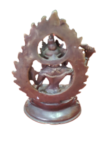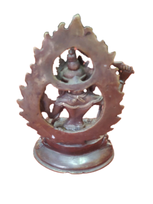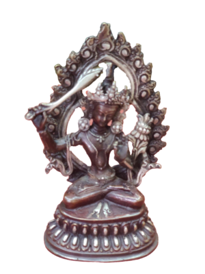 Tibetan Manjushri Statue – Brass is made in Patan Nepal by the process of sand casting. The weight of this statue is 0.34 kg and the dimenstion height=12.7cm and width=7.62cm.The material used to make this statue is Brass. Manjushree is the Bodhisattva who holds the flaming sword of enlightenment, by his left hand in a warning hand gesture in the left hand representing his realization of wisdom to cut through ignorance & wrong view.His right hand depicted in teaching holds the stem of a Blue Lotus flower upon which rests the Book (Pustaka) of Perfection of Transcendental Wisdom.