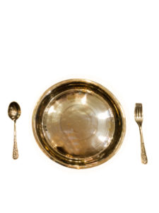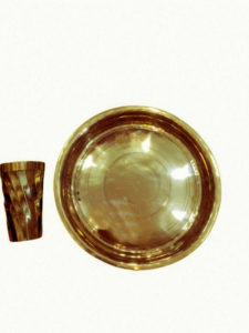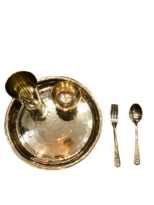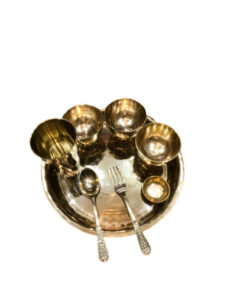 This Nepali Dinnerware set is called Nepali Thali made out of bronze (Kansa). In Ayurved, it is believed that Kansa dinnerwares are very good for health. This package contains 1 plate (Thali), 4 bowls(Kachaura), and glass and spoon.